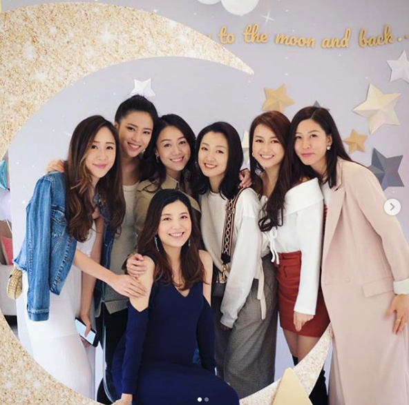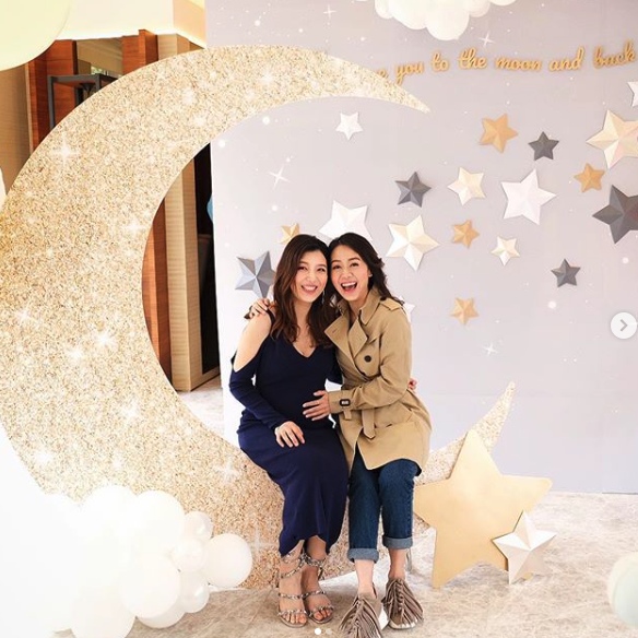 黃心穎坐喺彎月上跟單文柔合照,興奮咁話「BB 踢我呀!congratulations 靚媽 and 展鵬!陀得咁靚咁sok就快啲生多幾個啦!see you soon baby Q!」