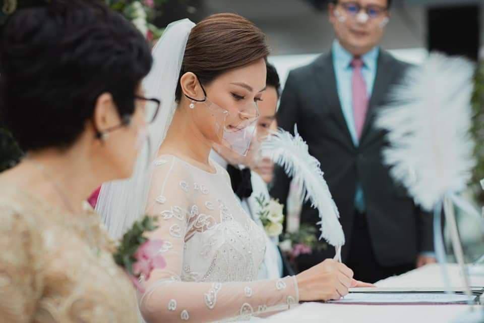 穿上性感白色婚紗的朱慧敏,跟同白色禮服的丈夫,非常登對!阿Bob除引領她進場,更親自為Queenie蓋頭紗,朱慧敏事後表示過程很感動,自己忍著眼淚,因為阿Bob見證她跟未婚夫的相戀經過,亦一直很支持自己。而好友王賢誌(Vinci)也是重要嘉賓,Queenie形容王賢誌關係如哥哥,而對方亦對Queenie的未婚夫讚不絕口。