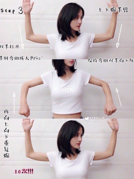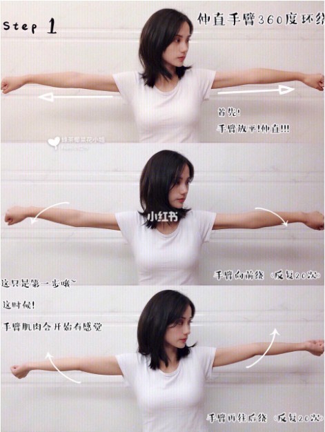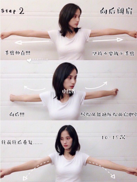 首先雙手向左右兩邊伸直,然後向身體後方伸展,同時夾緊肩胛骨,挺胸收腹,重覆10-15下~過程入面,肩膀唔可以向上縮,身體都唔可以向前傾,要保持直立~呢個動作除咗有助修飾手臂線條,都可以訓練背部以及胸部肌肉。