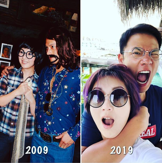 楊千嬅同丁子高於2009年喺美國秘密註冊結婚,之後再喺香港補辦豪華婚禮。當年有好多人都唔睇好呢段「姐弟戀」,如今二人牽手走過10個年頭,非常恩愛~千嬅今日就上載一張跟丁子高嘅「老人相」,透露因拍廣告關係,第一次化老人妝,扮演年老嘅自己,而老公則以神秘嘉賓客串演出。當兩個人對視,見到對方滿臉皺紋、頭髮花白,可以話係悲喜交集,千嬅感慨咁話:「仰頭一看面前那個80歲的他,鼻子馬上酸起來,那種莫名的感動和傷感,原來那種離別的恐懼是這樣的。」