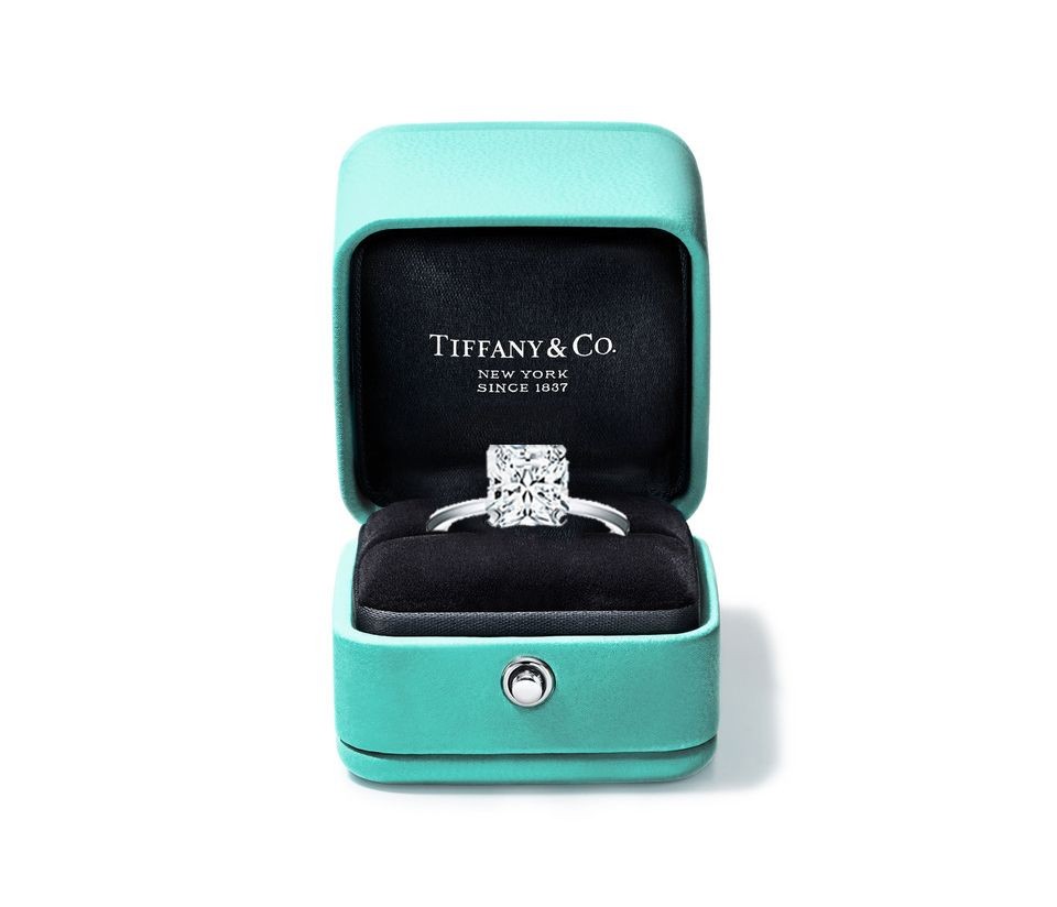 這款求婚戒指名為「Tiffany True」,上面的巨鑽採用了 Tiffany 嶄新獨有的方形混合式切割,之後再鑲嵌於鉑金戒指上,讓鑽石能矮平地置於手指上~