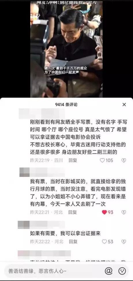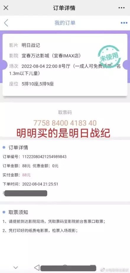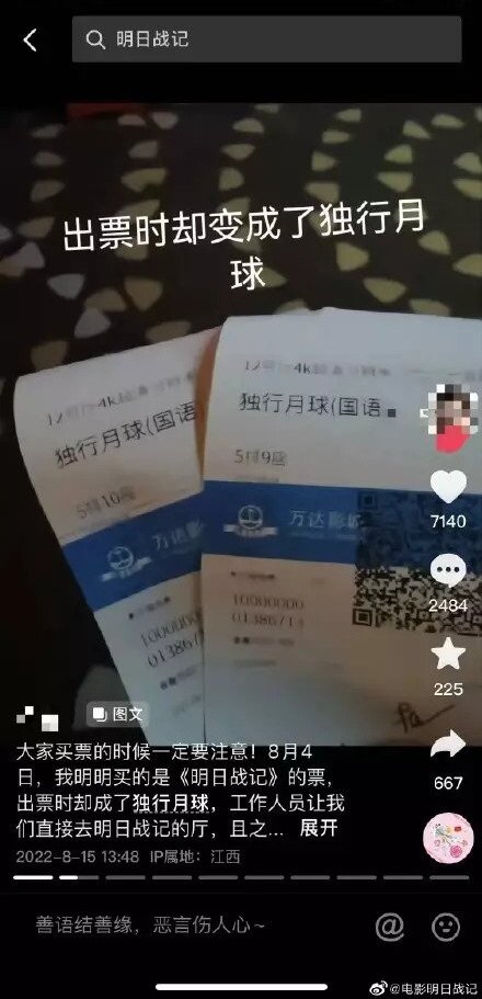 該名網民聲稱自己在網上買《明日戰記》的門票,到戲院取票卻變成《獨行月球》,而工作人員則讓觀眾用《獨行月球》的戲飛去播放《明日戰記》的電影廳看戲:「這是合起伙來一起欺負《明日戰記》嗎?還是說,國內電影行業早已全這麽幹了?」亦有網民表示,他買的戲飛是用手寫:「沒有名字,手寫哪個廳、哪個時間、哪個座位號。」