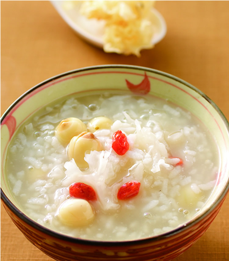 食材:米 100g 、蓮子 40g、白木耳 10g、枸杞 5g