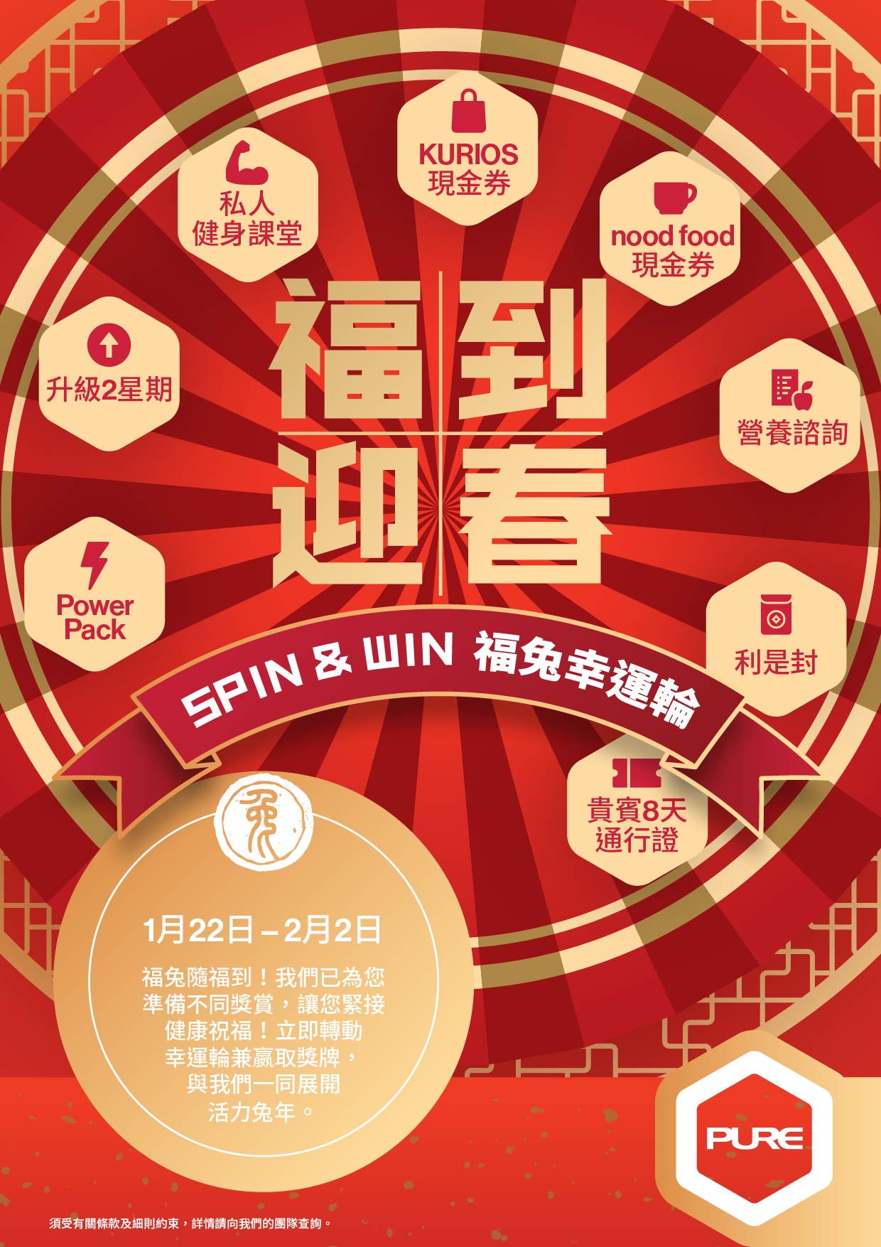 除十二生肖特別主題課程外,更可以轉動PURE 福兔幸運輪,贏得一系列激賞禮遇*,當中包括PURE Power Pack、私人教練、私人瑜珈課程、營養咨詢等,集各種實用獎勵,運動人士萬勿錯過!