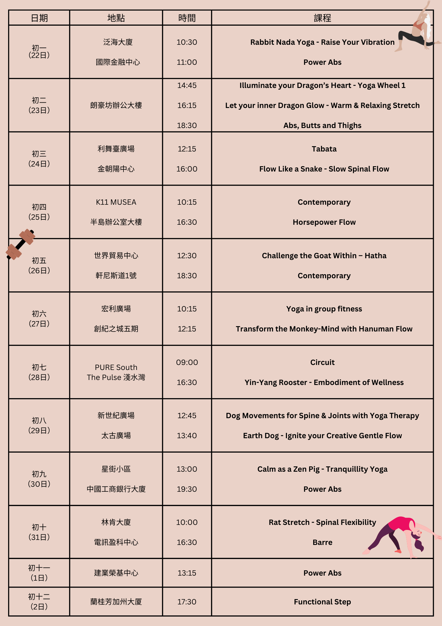 十二生肖主題實體特別課程又怎會限於兔、狗、龍呢?就連感覺慵懶的豬都與PURE一起動起來,想知道更多詳情,及與你生肖相對應的運動項目,就要大家親臨PURE一一發掘!不論是愛運動的你,還是好奇的你,都絕不能錯過!以下是指定PURE分店的新春特別課程時間表: