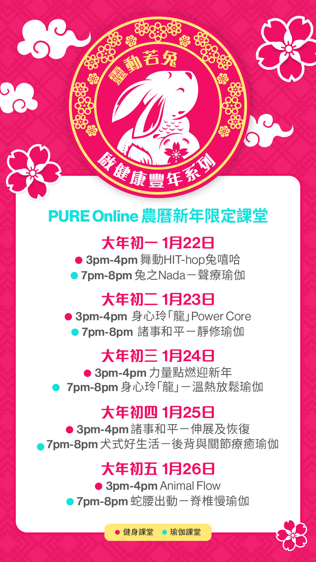 不論你是為避年,還是要留在家等親朋戚友到賀,這些都已經不是你不做運動的藉口!為方便大家,PURE Online將於1月22-26日(初一至初五)推出新春網上課程系列,每日都有不同主題,當中包括「舞動HIT-hop兔嘻哈」、「力量點燃迎新年」等等。為迎合活動多多的新春假期,網上課程更實行彈性安排,讓大家可以靈活調動時間,由兔年第一天起就養成運動好習慣!
