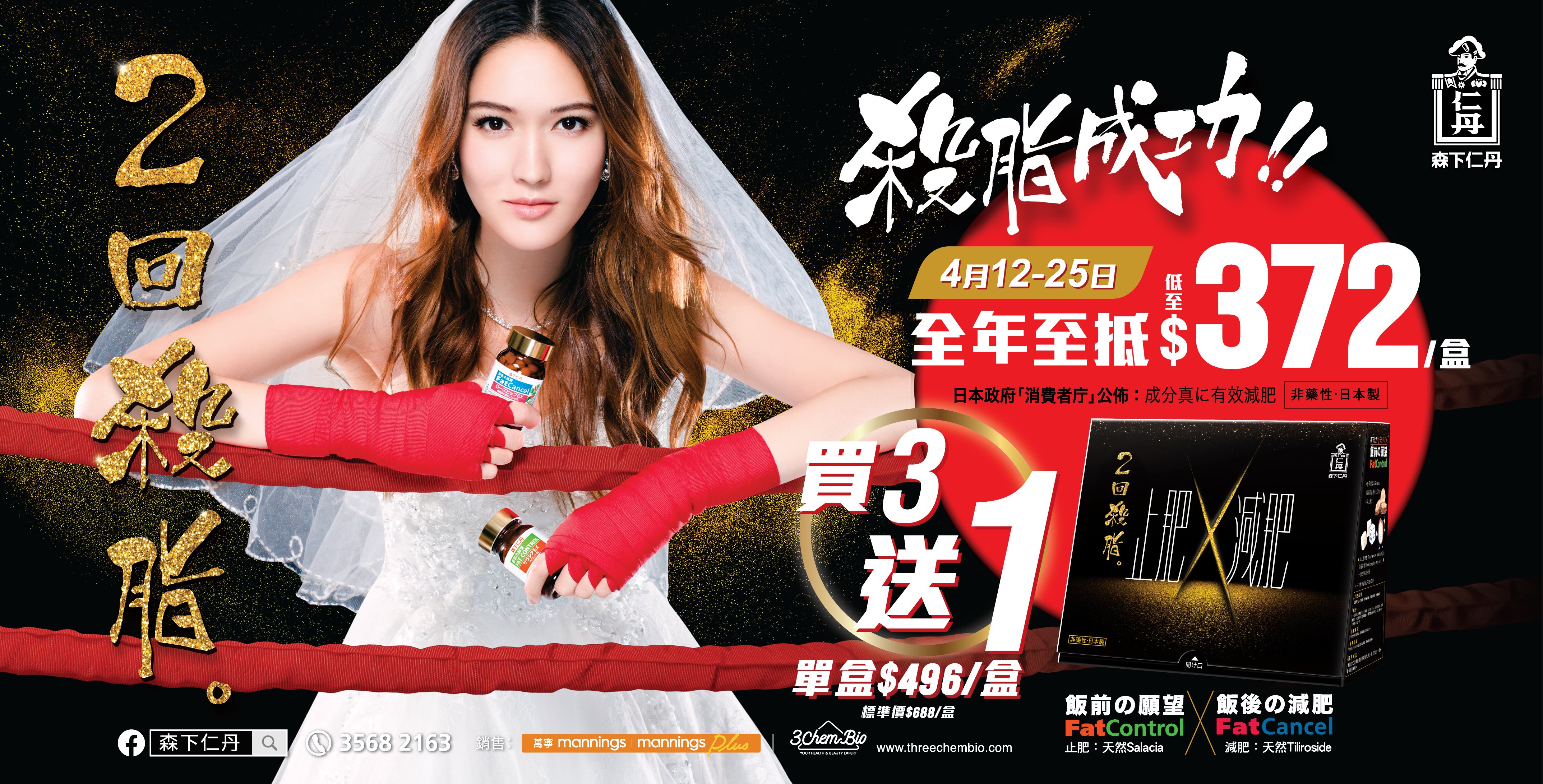 4月12日至25日期間,凡於萬寧及ChemBio入手【森下仁丹 2回殺脂】,即享限時優惠價$496(標準價$688/盒)+「買3送1」!計算下來,平均每盒只需$372,絕對是全年最抵價,讓你無痛入手,瘦身輕鬆,銀包零負擔,錯過定必後悔!