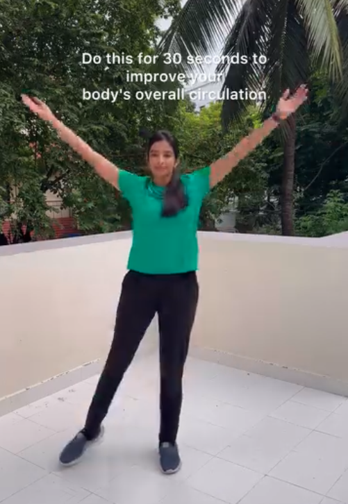 2.開合跳:雙腳跳開,雙手舉高,然後回到原位。這個動作活化全身肌肉,能讓你心跳加速,感覺充滿能量!