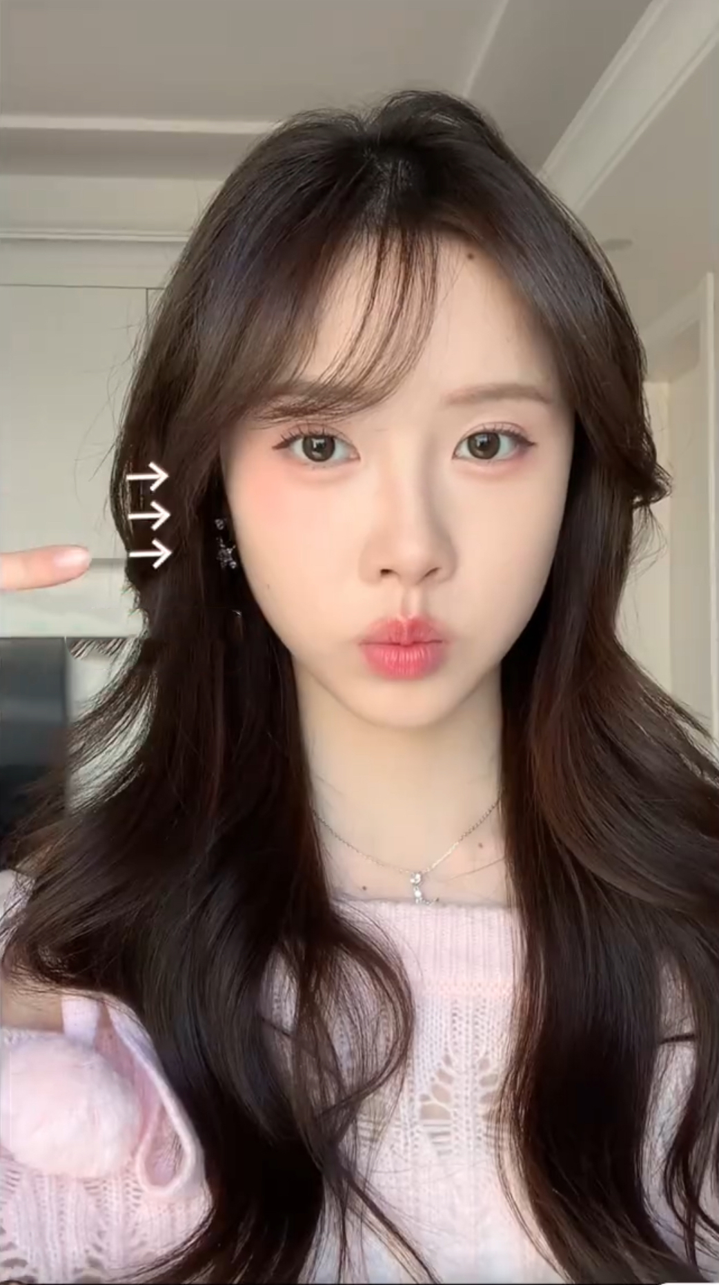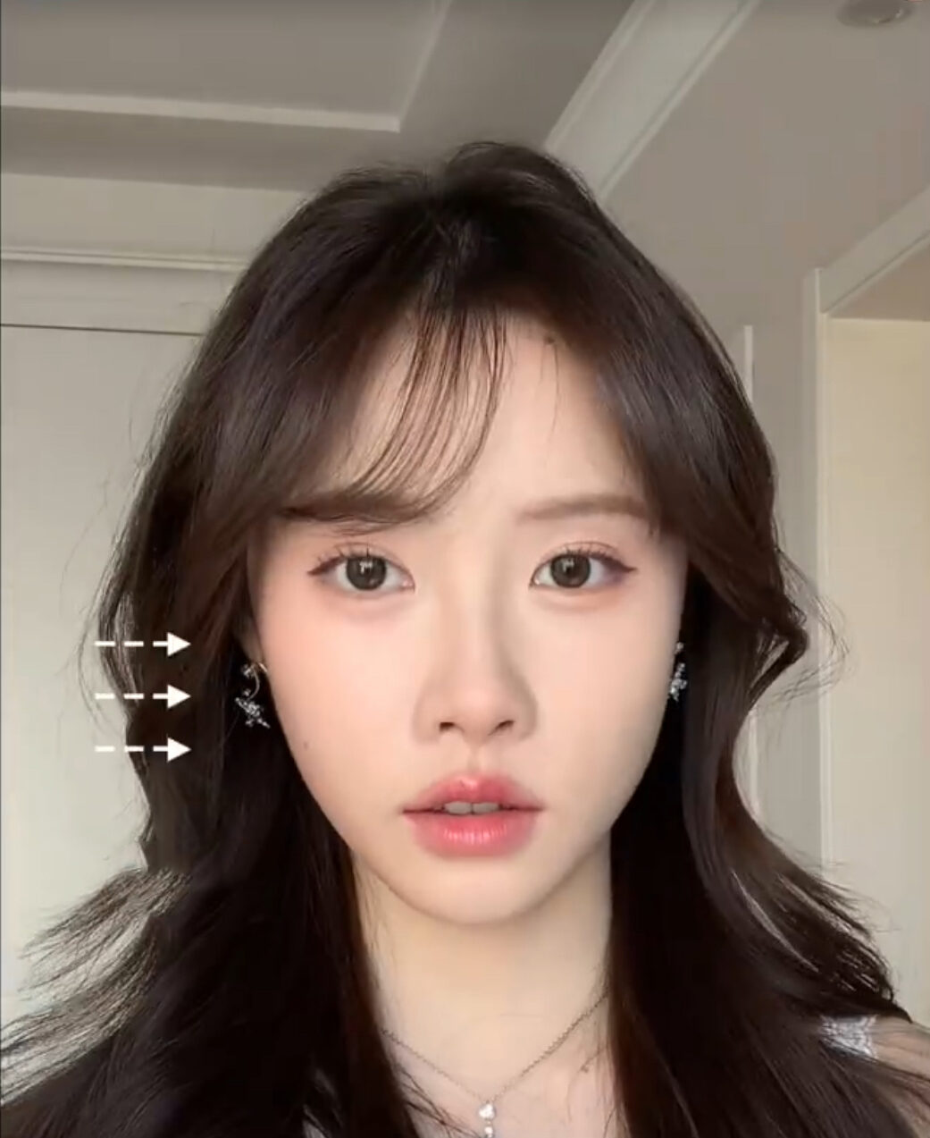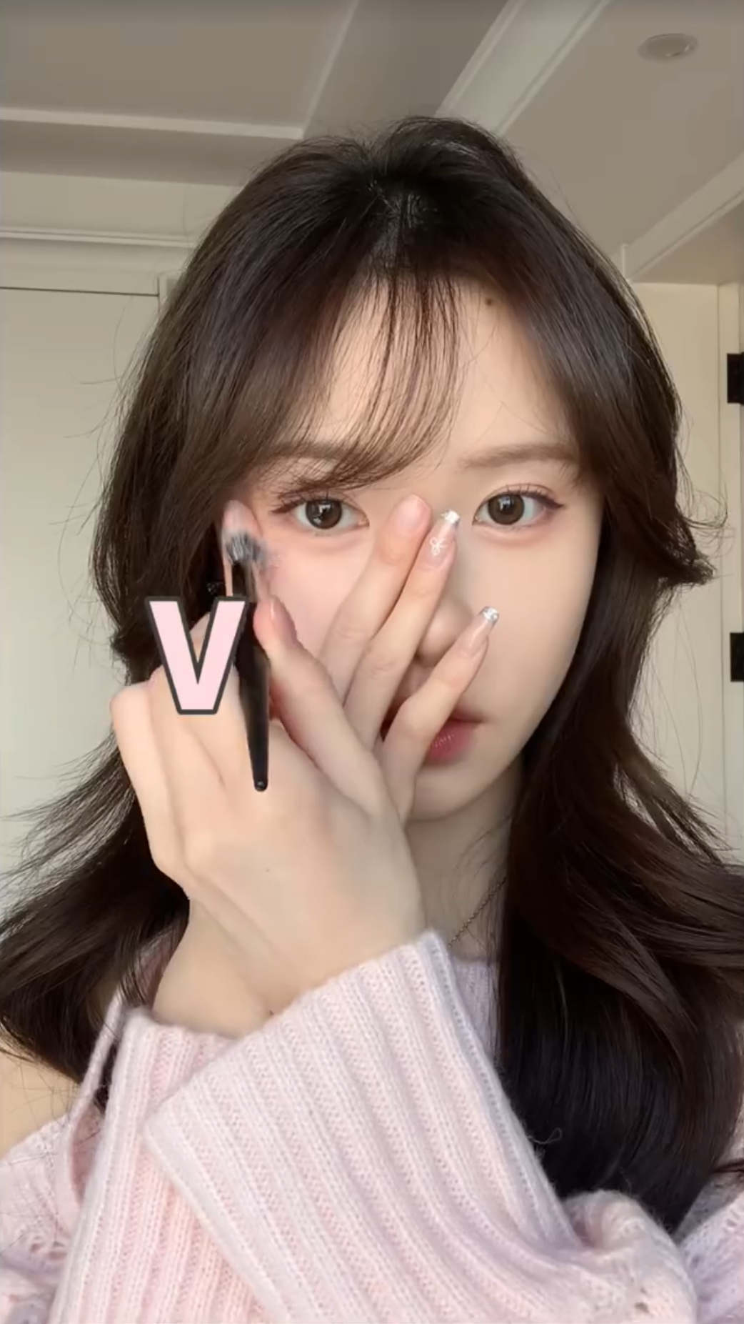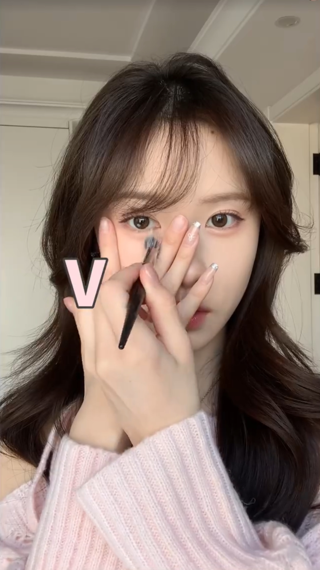 從耳際下方開始,沿著顴骨的位置畫出反向V字型。再使用化妝掃輕輕暈染V字型的邊緣,使顏色過渡更加自然,增強臉部輪廓的立體感。V字型的畫法強調了顴骨的立體感,並且通過兩邊向下的角度,視覺上達到瘦臉的效果,讓臉型更修長。對於希望改善臉部輪廓的女生來說,絕對值得參考!