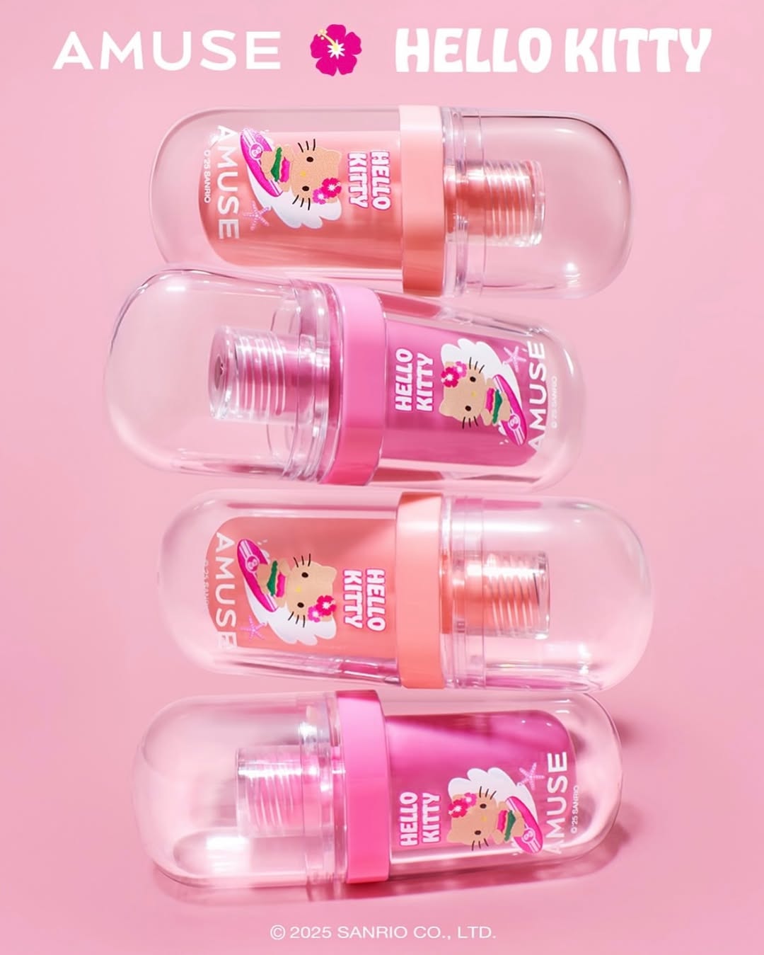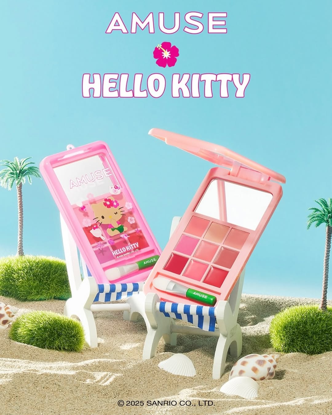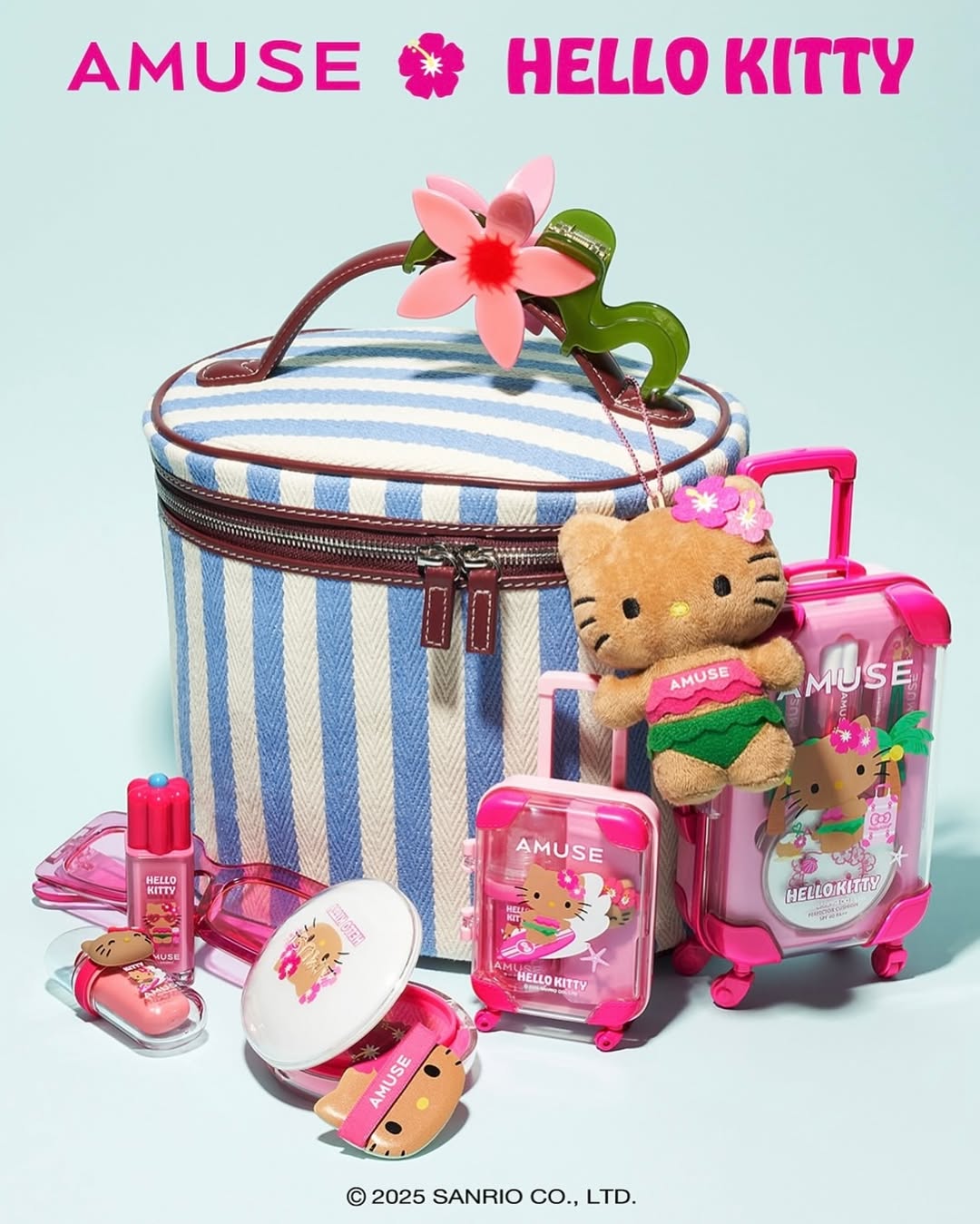 韓國人氣美妝品牌 AMUSE 於今年 4 月推出全新 Hello Kitty 聯名彩妝系列,包含氣墊、防曬乳液、果凍唇釉、露水唇釉、腮紅膏等單品。包裝融入「曬黑版」Hello Kitty 元素,充滿濃厚的夏日海島風情!購買套裝還可獲贈一個小型彩妝行李箱,方便收納粉撲等化妝品。