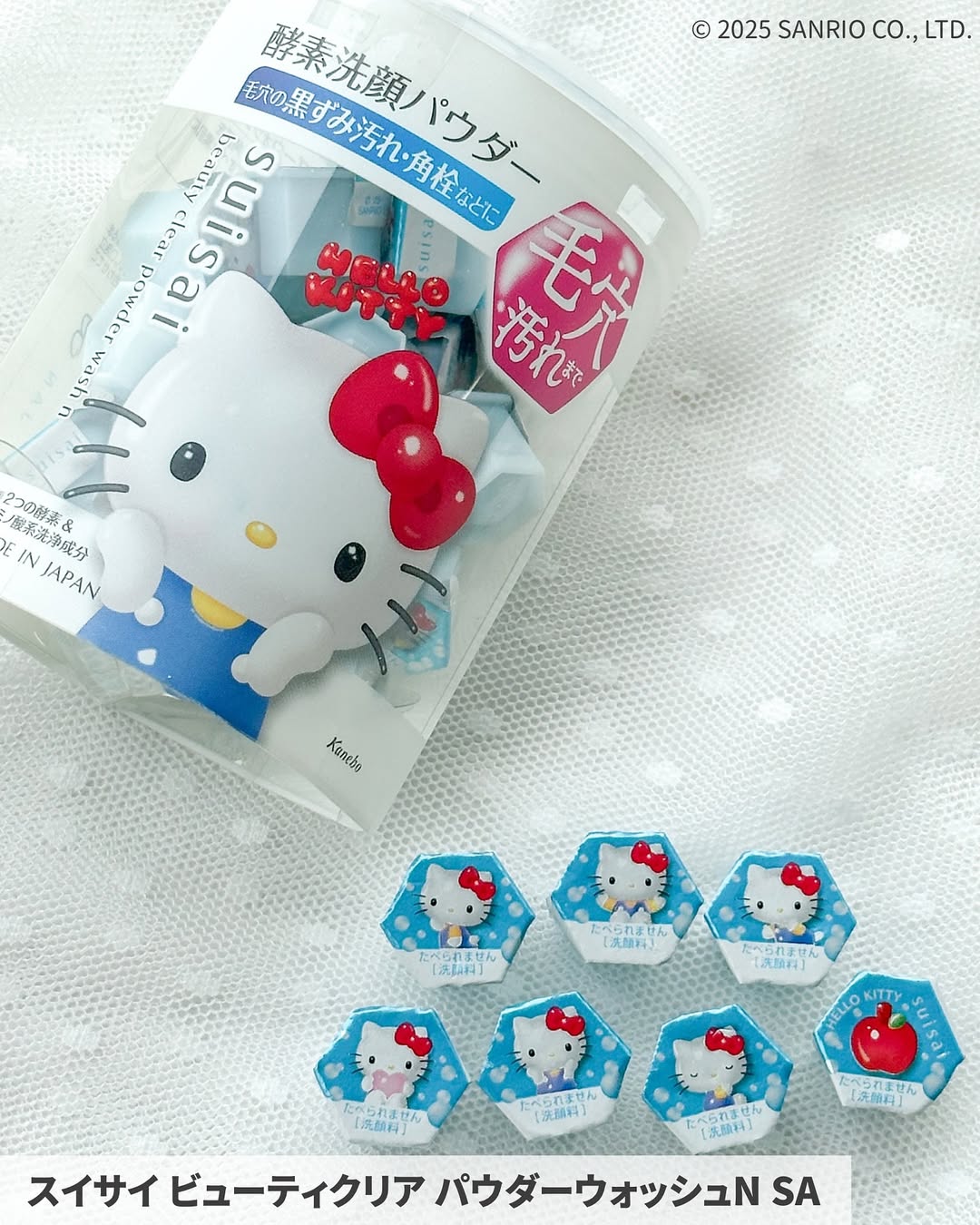 日本品牌 suisai 將於 6 月推出與Sanrio聯名的酵素潔顏粉系列,其中 Hello Kitty 款主打改善粉刺與黑頭。主要成分包含兩種酵素與「胺基酸系」洗淨成分,能溫和去除老廢角質與毛孔污垢,改善肌膚粗糙與暗沉。單顆包裝設計,便於旅行攜帶。