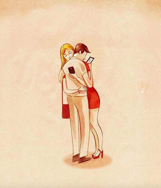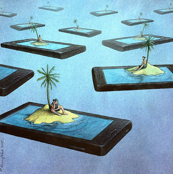 科技淘汰嘅速度緊貼跟住發明嘅腳步,喺人人手裡一機嘅時代,「科技冷漠」早已成為社會現象。下面集合咗唔同風格嘅諷刺藝術家作品,每幅插畫精確咁戳破現代人為自己包裝嘅美麗謊言,令人們正視科技和現實生活嘅拉鋸,引起咗相當多嘅迴響和熱烈討論,大多數人有因此而感到遺憾、恐懼,但亦有人留言分享對抗科技冷漠嘅心得。