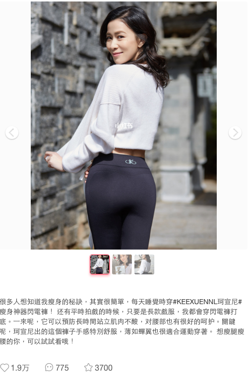 KEEXUENNL 閃電褲面料左富含角鯊烷精華、小球藻提取物、勃那特旋藻粉、綠咖啡豆提取物、白芸豆提取物同紅石榴精華等元素所組成既創新納米級膠囊,具高效燃脂既作用;特別之處係面料更加入咗高濕度玻尿酸精華液,當褲跟肌膚摩擦時,就會釋放出精華成份,令皮膚潤澤緊緻,從根源去改善妊娠紋同肥胖紋等肌膚問題~