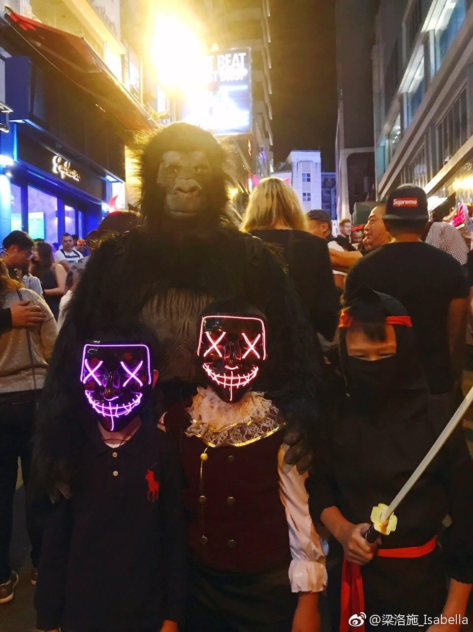 梁洛施好錫3個小朋友,呢位年輕媽媽思想上都好新潮,萬聖節就以黑猩猩造型帶2個小朋友去「蒲」。