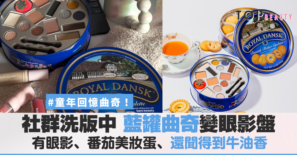 如果你童年曾經滿懷期待地打開家裡那罐藍色Royal Dansk曲奇餅,卻發現裡面塞滿了針線、鈕扣和剪刀,那你絕對能理解這次聯名彩妝有多惡搞。美妝品牌Kara Beauty直接把那個充滿童年回憶的藍色鐵罐,變成一盤14色眼影,而且打開後真的有眼影,不是針線包。光是想像收禮者拆開那一刻的表情,就已經值得下單了。