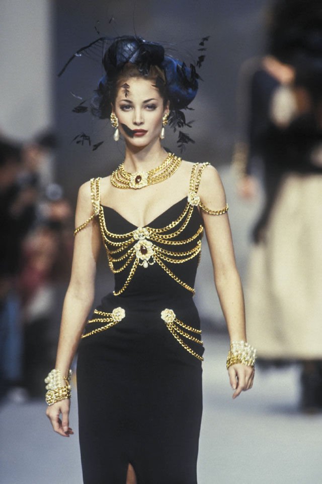 Lily 當日並沒有選擇誇張的服裝,反而穿上了這條古董晚禮服,這襲驚豔的裙子是1992年 Chanel 高級訂製服,黑色低胸貼身的設計,加上高貴的金屬鏈子元素,讓模特兒穿上它氣場立馬變強大,集冷艷和高貴於一身!