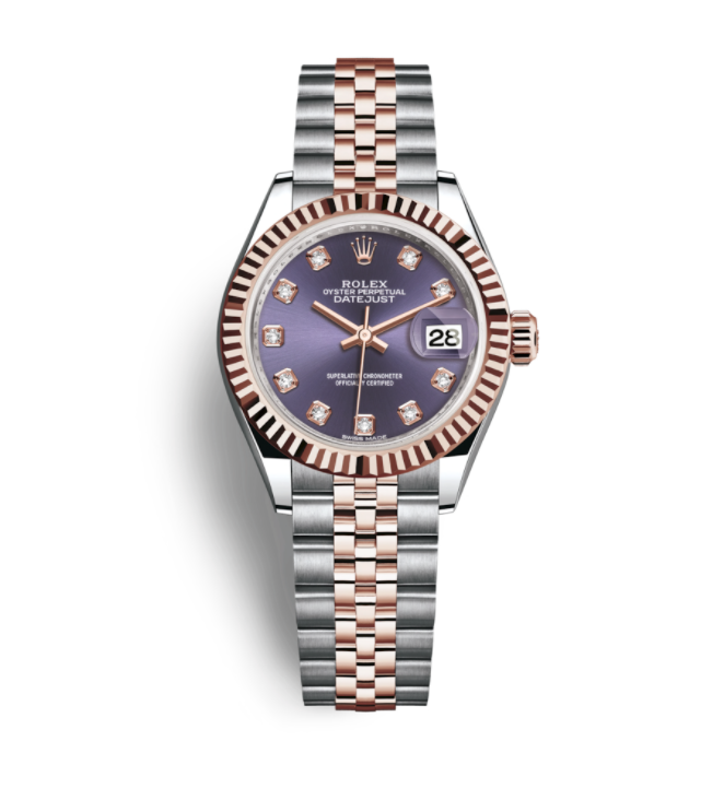 Rolex少見嘅紫色錶面加上鑲鑽數字位更顯尊貴,呢隻色配搭玫瑰金坑紋外圈有意外驚喜!
