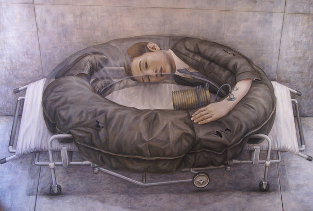 此作品於2003年面世,一貫家石田徹畫風,表面現代人被工作和社會打壓的感覺。人手上有個充氣位置,看似睡在床上,但事實是塞在一個小空間內。這感覺每個人都有曾感受過吧!