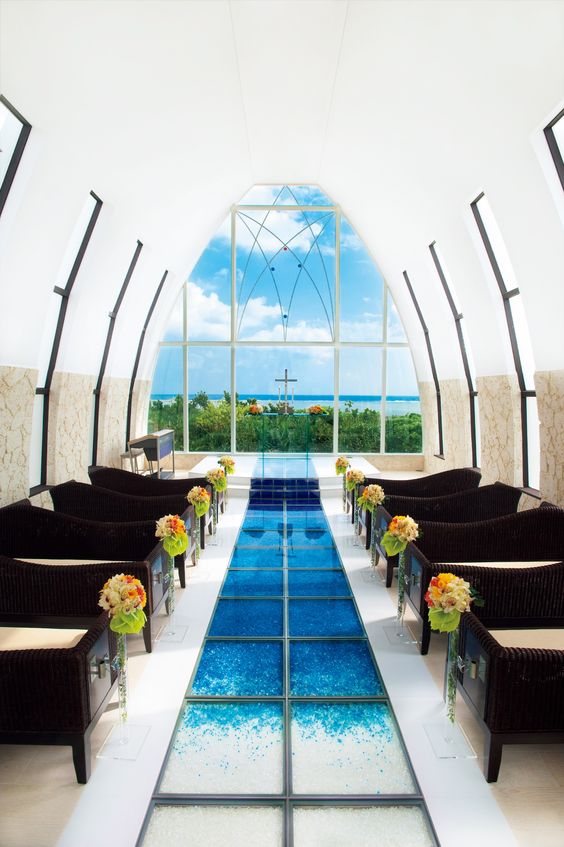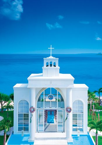海之教堂又名Arluis Suite,位於恩納村海域最近的海邊,教堂以落地大玻璃的設計讓新人們一覽藍天白雲,在陽光和大海見證下他們的愛。戶外婚禮場地,簡單的裝飾和擺設都不失大體。婚禮風格和Six Senses Resort有異工同曲之妙。喜歡到日本又想有一樣效果的朋友不妨參考下。