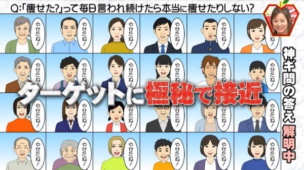 日本一個深夜節目「Summers的神疑問」專門收集觀眾們心裡的疑問,當主持人決定要就某主題做實驗時,他們就會找專人進行很認真的測試!而這次要進行的實驗就是——聽得多「你瘦了」這句說話,真的會能讓人成功瘦下來嗎?