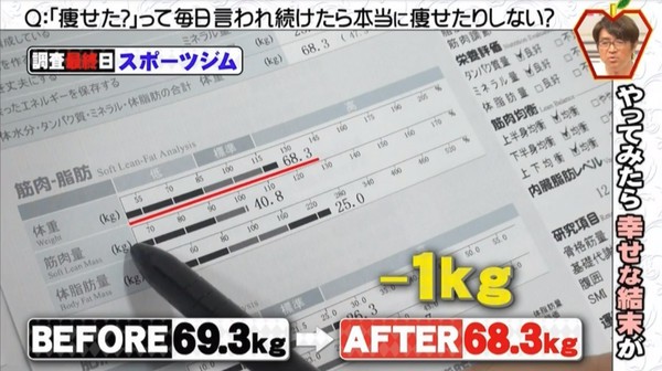 而在不久後瀧川久美子竟下定決心減肥!根據她的家人所說,久美子平時喜歡喝酒和吃零食,而且個性比較懶惰,不過在有人跟她說她瘦了之後,她下定決心開始戒酒、上健身房。最後的實驗結果她成功在兩星期內瘦了一公斤!