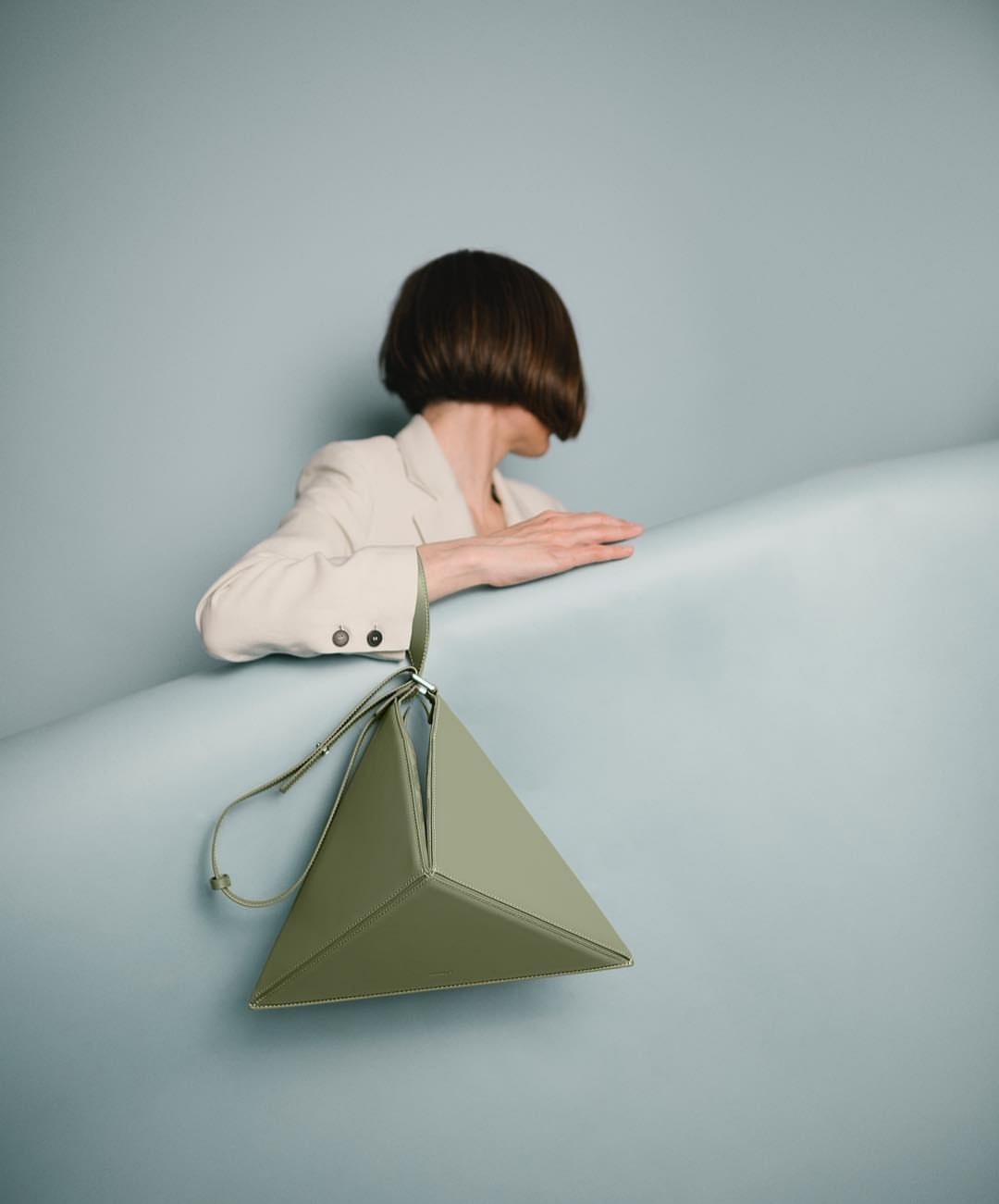 Convertible Flex Bag 外型看似幸運曲奇的三角設計,不論是形狀還是肩帶都可自行調節,希望造型看起來輕巧一點時,三角形就最適合了。