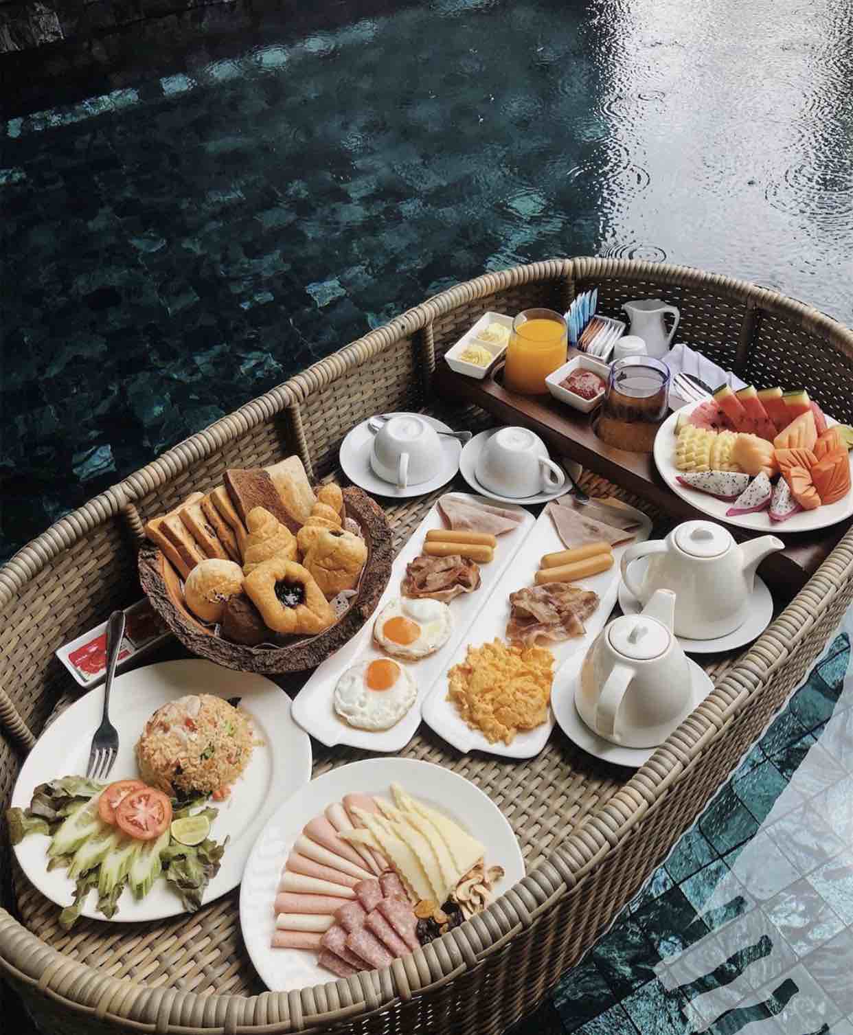 Resort仲有為客人準備豐富早餐,工作人員會將餐點放入籃再放到水面,讓客人可以喺水上用餐,係好特別嘅體驗,唔少旅客都忍唔住同餐點打卡合照~