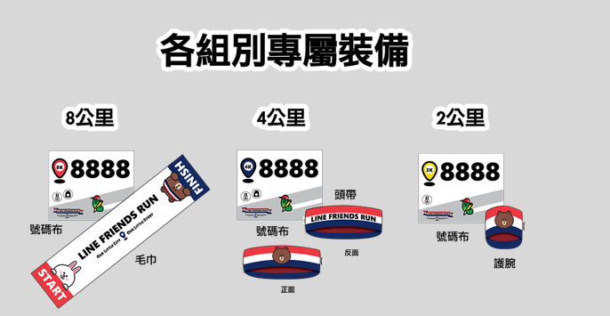 另外各個組別都會有號碼布及專屬裝備,8公里賽事有毛巾、4公里有頭帶、2公里則有護腕。
