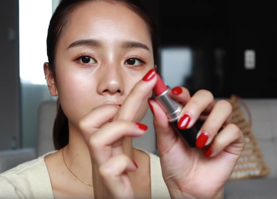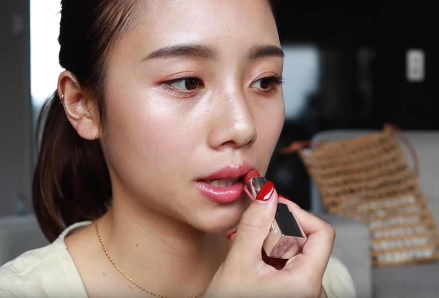最後再直接整支塗上較為深色的橘粉唇膏,用紙巾輕壓多餘的唇膏,妝容就大功告成。