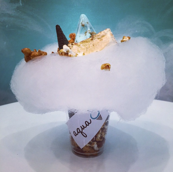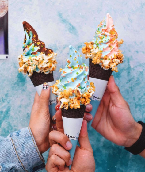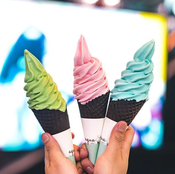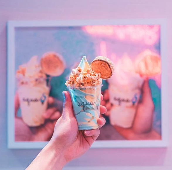 這間雪糕專門店叫做「Aqua S」,最熱賣、受歡迎的就是「夢幻雲朵雪糕」,在一大片的棉花糖上放上雪糕和裝飾,簡直美得像藝術品一樣,而藍藍的雪糕是店主從日本沖繩帶來的海鹽雪糕!