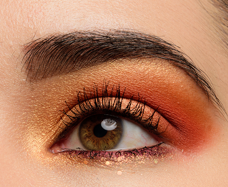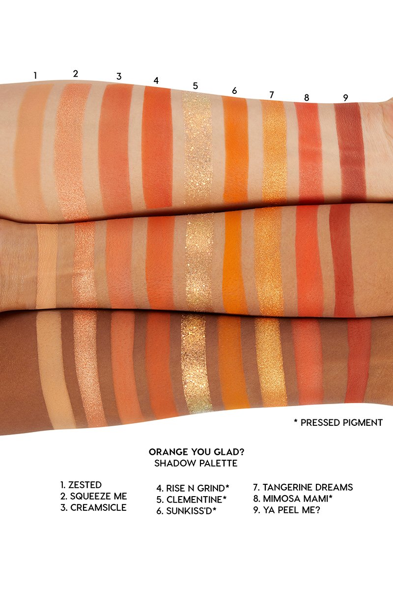 Orange You Glad系列有多款產品,就好似唇彩、化妝掃、單色眼影等。不過最受注目當然係佢嘅眼影盤啦~一盒九色嘅眼影盤,集合各種唔同嘅橘色色調,除咗有霧面質地同珠光質地,人面仲有一格幻光閃片眼影,唔同角度望過去會有幻彩效果,去party用佢一定會成為全場焦點!
