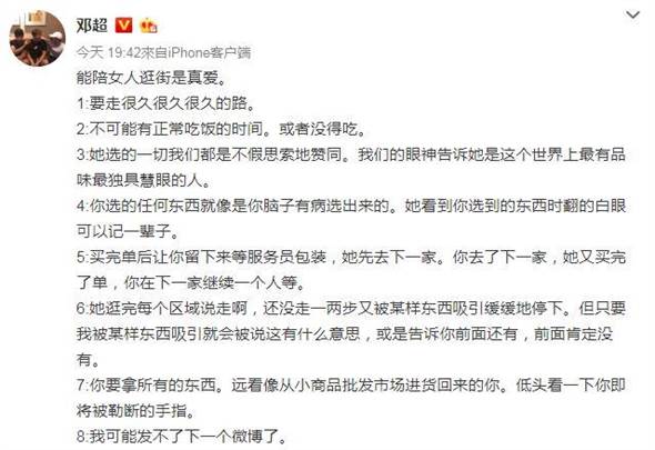 鄧超表達了自己在陪妻子逛街的感受:第一點是要走很久很久很久的路、第二點是不可能有正常吃飯的時間或者沒得吃⋯⋯第六點是要一個人等店家包裝、第七點是要拿所有東西拿到手指像要被勒斷~最後鄧超更幽默地留下第八點:我可能發不了下一個微博了,暗示孫儷買太多東西,讓他拿到手斷。(也太可愛了吧~~~)