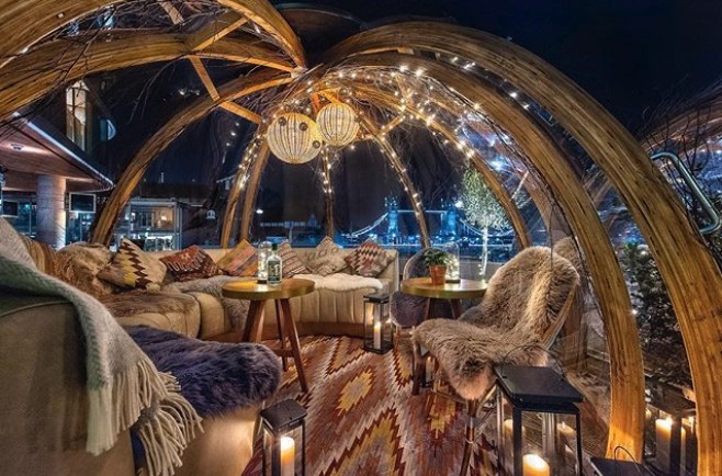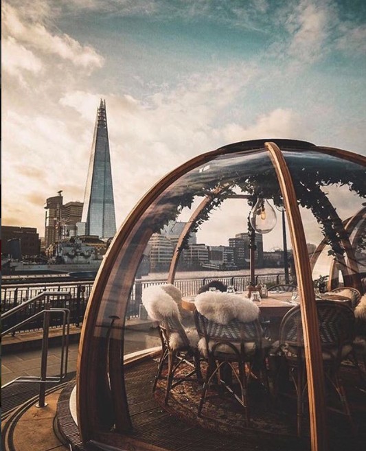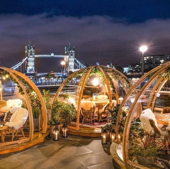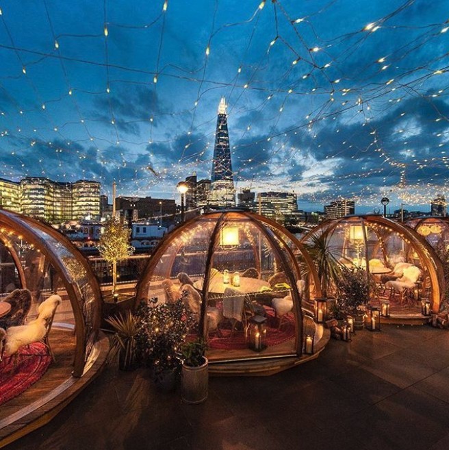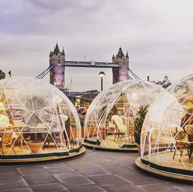 倫敦的冬天寒冷,Coppa Club為了讓客人們能在溫暖的環境下,一邊吃飯一邊欣賞泰晤士河的美麗景色,所以在露台設置了8個芬蘭冰屋造型的透明玻璃球,這幾個夢幻的Igloo便成為了餐廳的「招財球」,也吸引了大批網紅和遊客前來朝聖打卡!
