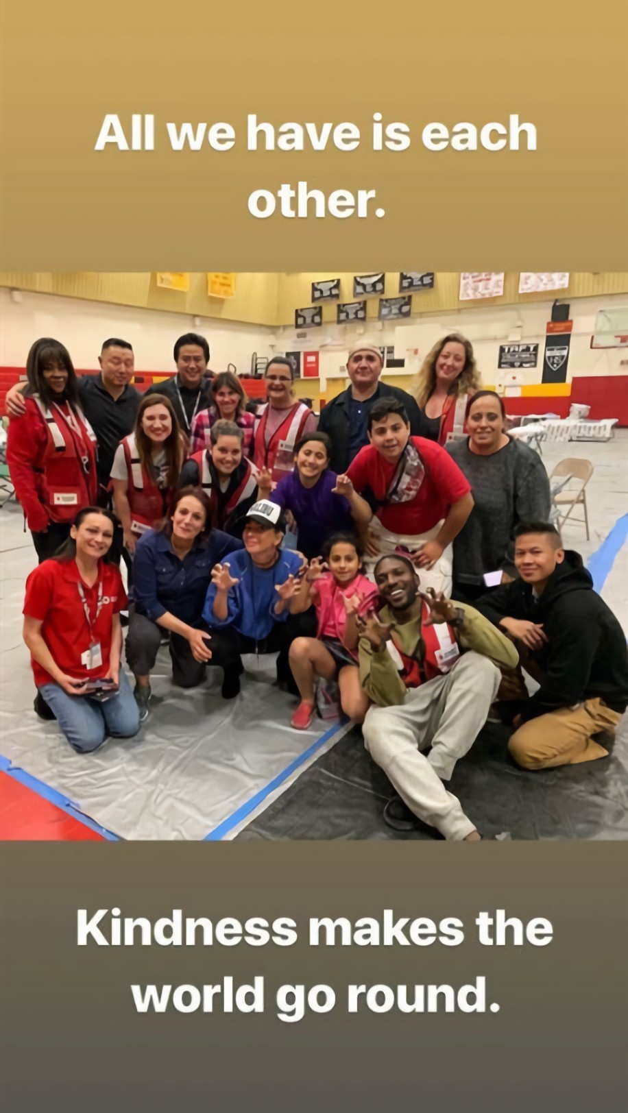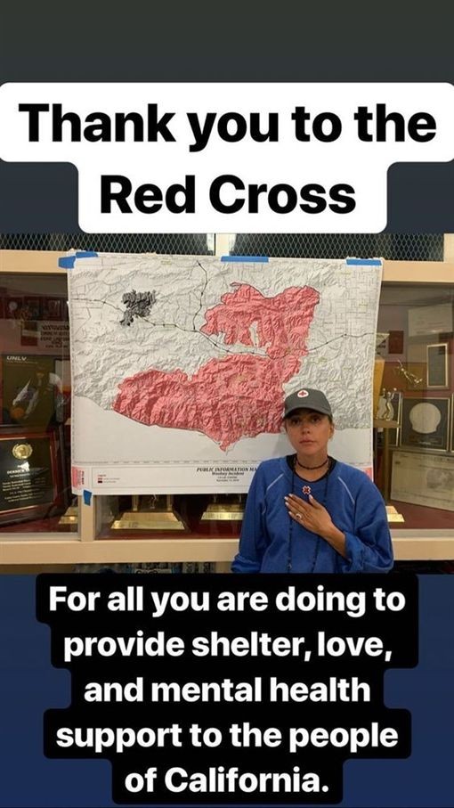 但不是每個人都這麼幸運,成千上萬的加州居民痛失家園,有見及此Gaga在被撤離後,不到幾天又再出現在洛杉磯的一所中學的臨時庇護所中,向各災民送上暖暖的安慰:「我知道我們彼此不認識,但我愛你們,現在是很緊急的狀況,但是你並不孤單。」