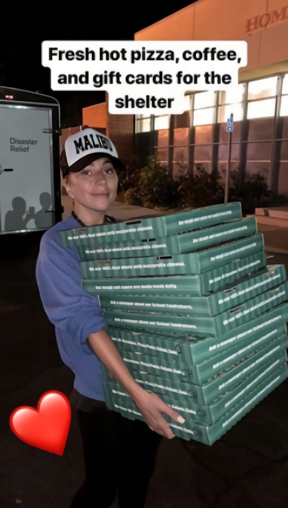 當天素顏、身穿衛衣運動褲的她更身體力行,親自把多盒Pizza、咖啡以及禮物卡到當地各個臨時庇護所,希望盡小小的力量來幫助災民。