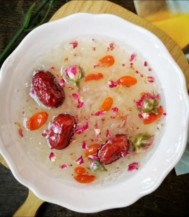 乾雪耳半朵、乾玫瑰花15朵、去核紅棗6粒、枸杞12粒、冰糖隨心