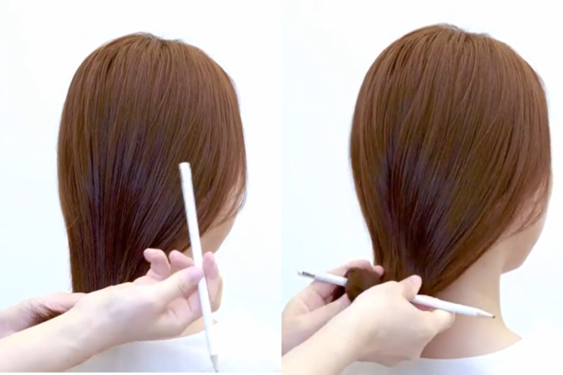 抓順頭髮後,利用一枝筆放到髮尾的地方,從髮尾的地方開始順著筆往內收。如技術好,而頭髮長度又適合的話,會往內收時不會造成頭髮碎的出現。