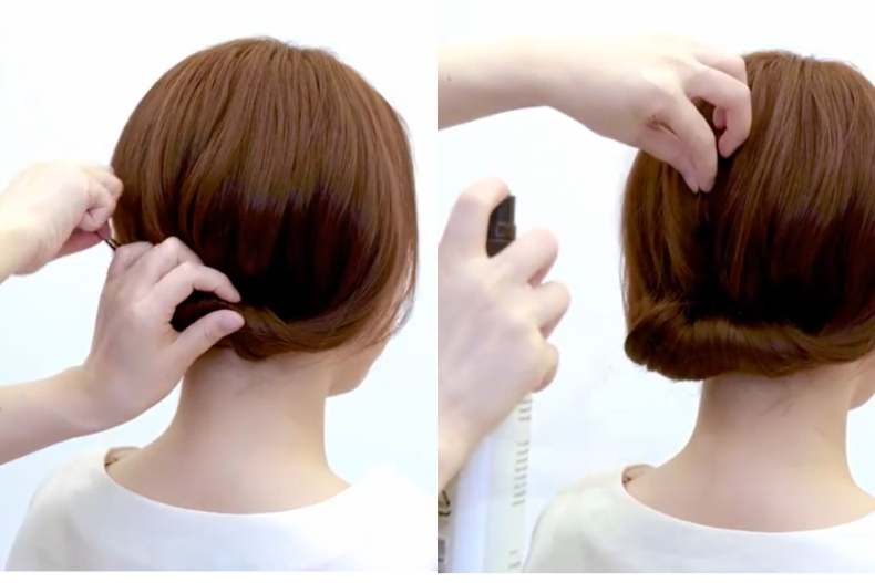 最後把筆抽出來使用U型髮夾來固定髮盤。建議女生左右兩邊都用上髮夾固定,免得髮盤輕易倒下。只要以噴上定型液來加強盤髮的塑形便可。如想增加氣質感覺,可輕輕地拉出一些頭髮,提升空氣感。