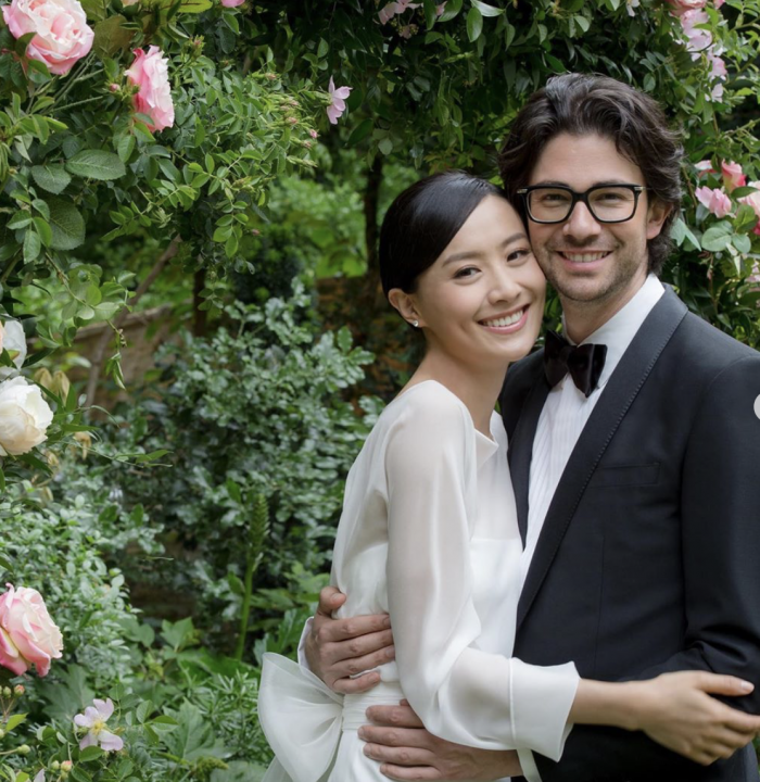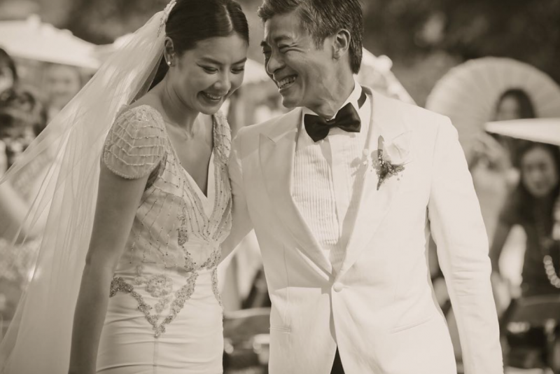 在陳法拉和丈夫的婚照中,雖然一切都簡單純樸,優雅的禮服加上簡潔髮髻,在她幸福笑容的襯托下,也顯得閃閃生輝。