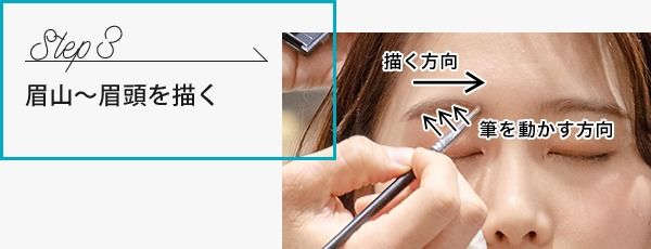 Step 2:利用眉刷從眉山繪畫至眉尾位置。需要打直眉刷,由眉山畫至眉尾。而訣竅是訣竅選用一支長而硬身的眉刷。