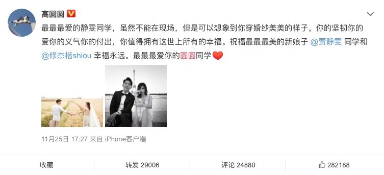 日前賈靜雯和修杰楷在峇里島幸福成婚,高圓圓卻沒有露臉,原因是臨出發前才發現護照已過期,圓圓只能留在家默默祝福賈靜雯:「最最最愛的靜雯同學,雖然不能在現場,但是可以想象到你穿婚紗美美的樣子。你的堅韌你的愛你的義氣你的付出,你值得擁有這世上所有的幸福。祝福最最最美的新娘子賈靜雯同學和修杰楷幸福永遠。最最最愛你的圓圓同學」