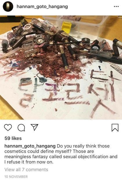 不少韓國女生都把長髮剪去、把化妝品扔掉,然後拍照上傳至Instagram,以示自己支持「#Escape the Corset」的女權運動。這個運動是針對韓國對女性的傳統審美觀:化妝、長髮、不能戴眼鏡,參與運動的韓國女生目的就是要打破這種單一的審美觀。