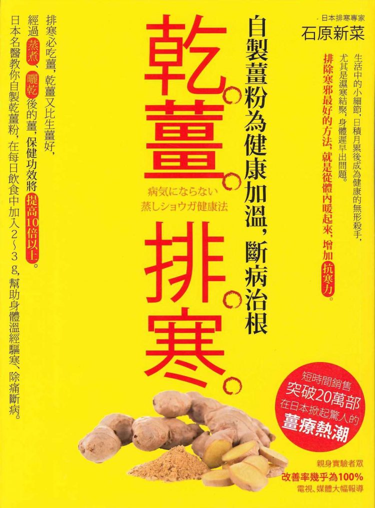 日本有名中醫石原愛菜在書中《乾薑排寒》中推薦讀者用「乾薑」泡茶喝,很多讀者都大讚飲用乾薑茶後,身體各方面都有大改進,手腳冰冷、水腫、血壓、經痛、便秘等症狀都大大減退,這本書在日本短時間便售出超過20萬本,更掀起「薑熱潮」!石原愛菜本來飽受便秘、經痛、痔瘡和暗瘡的折磨,與父親石原結實的交流,她開發出了將生薑蒸煮、曬乾的「乾薑自製法」。