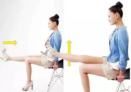 坐椅子前面的1/3處,把腿輕抬起,腳尖往下,之後再換腳跟往下。快速來回重覆這個動作,可以明顯感覺到小腿肚那裏在運動了。這個動作使小腿筋可以拉長,小腿的線條會更修長更好看。