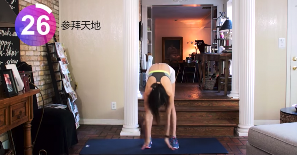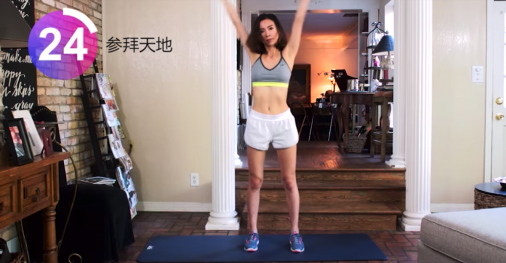 把雙腳打開至跟肩一樣闊度,再把手伸高到頭頂,然後彎腰到腿尖。要注意得是雙腿需盡量要伸直並連續做30秒,最後休息10秒。