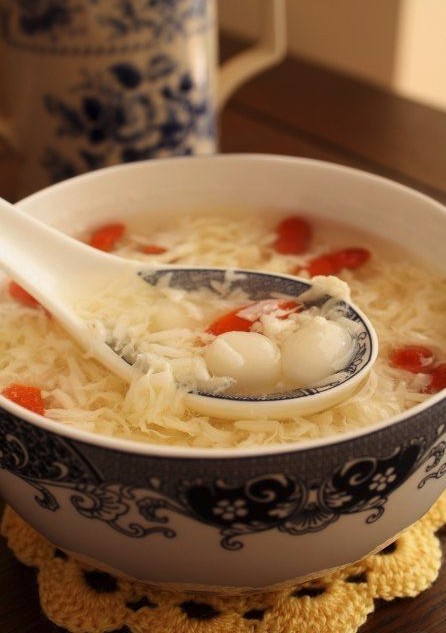 在250毫升水中加入3粒去核紅棗、3大匙酒釀、少許枸杞以大火煮至水滾後,打1隻蛋入去煮3分鐘,加適量紅糖後再煮1分鐘。