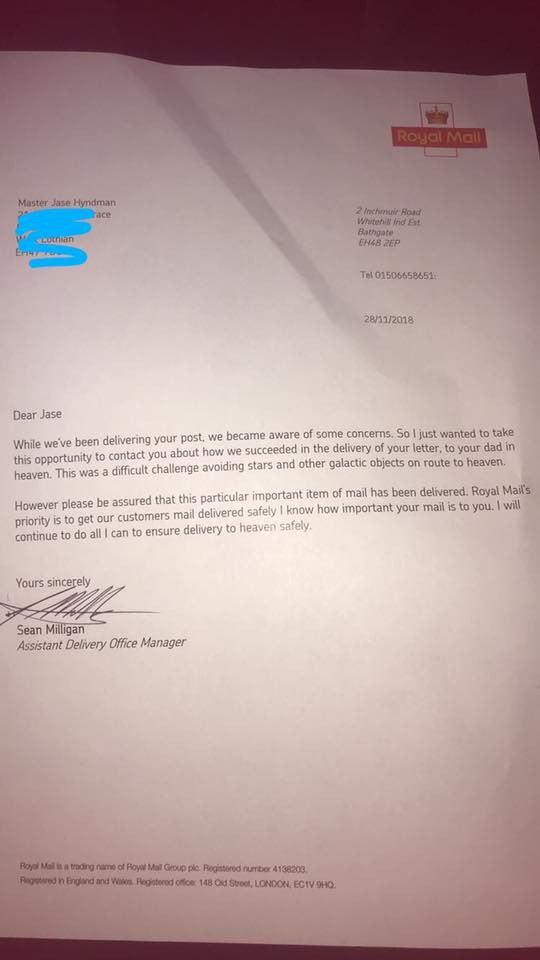 原來呢封信喺來自皇家郵政 (Royal Mail) 嘅回信。郵差叔叔似乎明白小孩子心意,怕佢會失望,於是皇家郵政經理喺信上寫道:「我知道這封郵件對你來說有多麼的重要,且皇家郵政首要任務就是要把客戶的信安全送達,所以請你放心,這封你對爸爸祝福的信件,我們一定會想盡辦法送到天堂。」皇家郵政經理又於信入面指:「往天堂的路是很艱難的挑戰,因為要避開星星和銀河系天體」,但已經順利把信送往天堂。