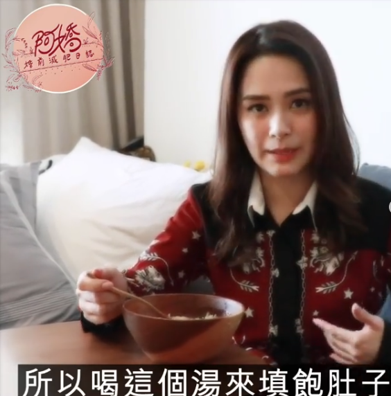 阿嬌指出,佢以花膠湯調理身體同補充能量,為咗控制胃口,只會食肉同菜,戒甜食、一切澱粉質食物,配合運動,短短幾日已經減咗5、6磅,相當見效。而阿嬌嘅目標就係由51.3 kg 減至45 kg。