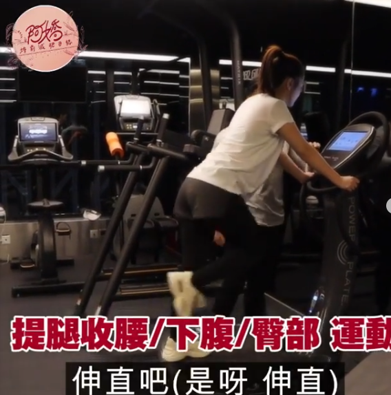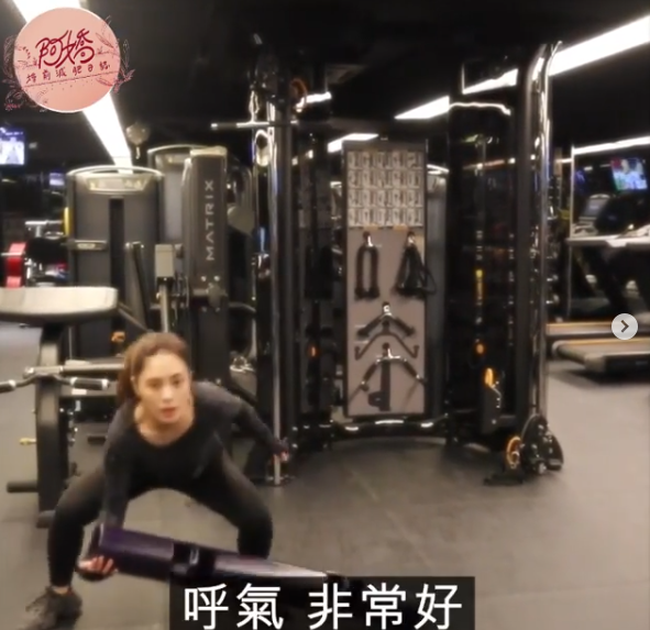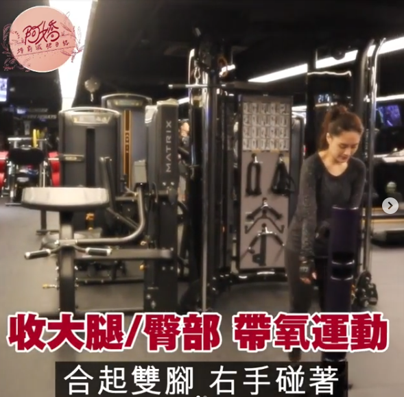 運動方面,阿嬌以運動器材作輔助,完成深蹲運動。深蹲可以令女生有性感翹臀,同時收緊大腿,緊緻下身線條~