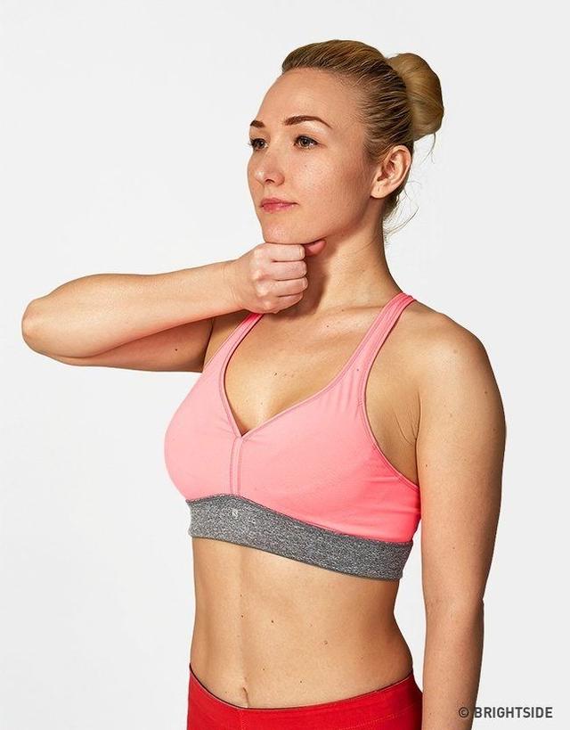 握緊拳頭,以拳頭頂著下巴,用下巴按拳頭5秒鐘,然後放鬆5秒鐘。把這一動作重複兩三次。
